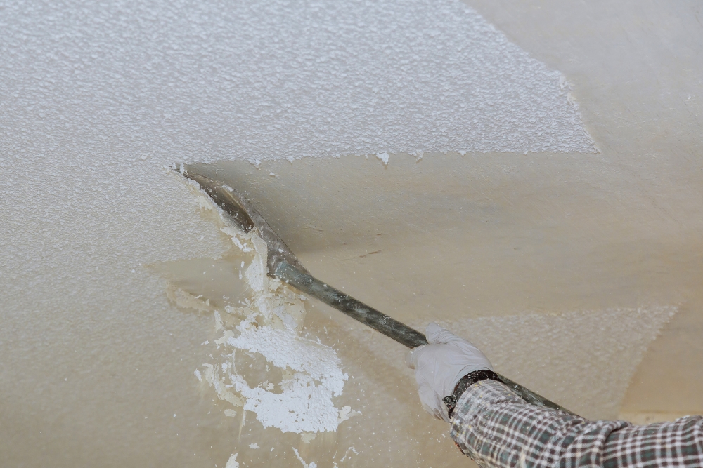 If your home was built before 1985, stop before anyone scrapes anything. The popcorn material used in that era regularly contained asbestos, sometimes as much as 10 percent by content. You cannot tell by looking at it. The fibers are microscopic. The only way to know is a lab test.